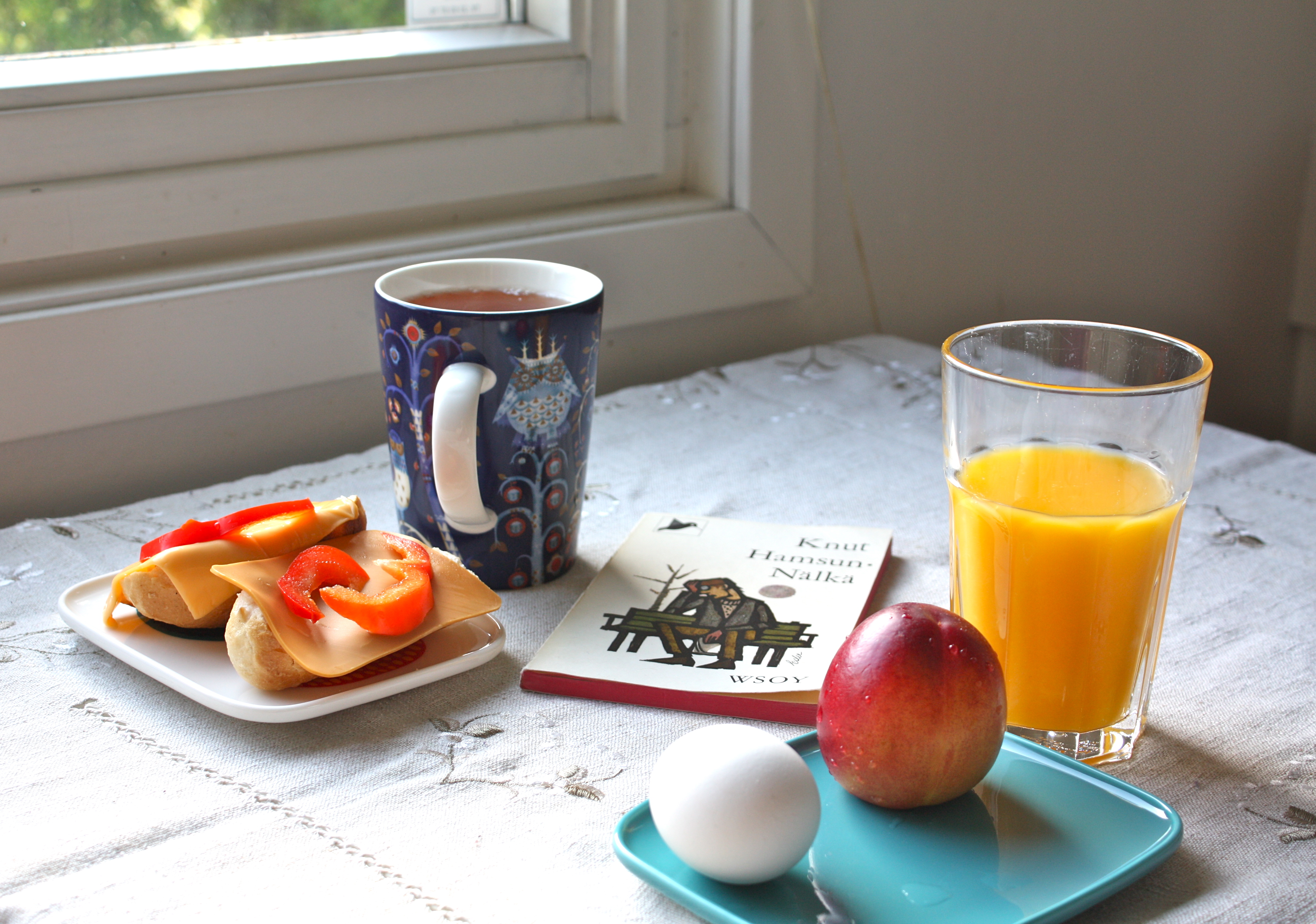 Lukumaraton on täällä! Tarkoitus on siis lukea yhden kokonaisen päivän ajan, aamusta iltaan, ilman suurempia keskeytyksiä. Suunnitelmani oli nousta tänään aikaisin, mutten päässyt eilen ajoissa nukkumaan, koska… luin sängyssä liian pitkään! No, nyt on kuitenkin aamupala pöydässä ja vierellä maratonin ensimmäinen kirja: Knut Hamsunin “Nälkä“. Olen lukenut Hamsunilta aikaisemmin “Maan siunauksen” ja “Viktorian“. “Maan siunaus” oli paksu ja jokseenkin puuduttava kuvaus köyhien maalaisten elämästä, mutta kirjassa oli kuitenkin myös kiinnostavia feministisiä ja yhteiskunnallisia piirteitä. “Viktoria” oli soma pieni klassinen rakkaustarina 1800-luvun lopulta. Jännä nähdä kuinka tämä Hamsunin esikoisteos eroaa noista toisista.