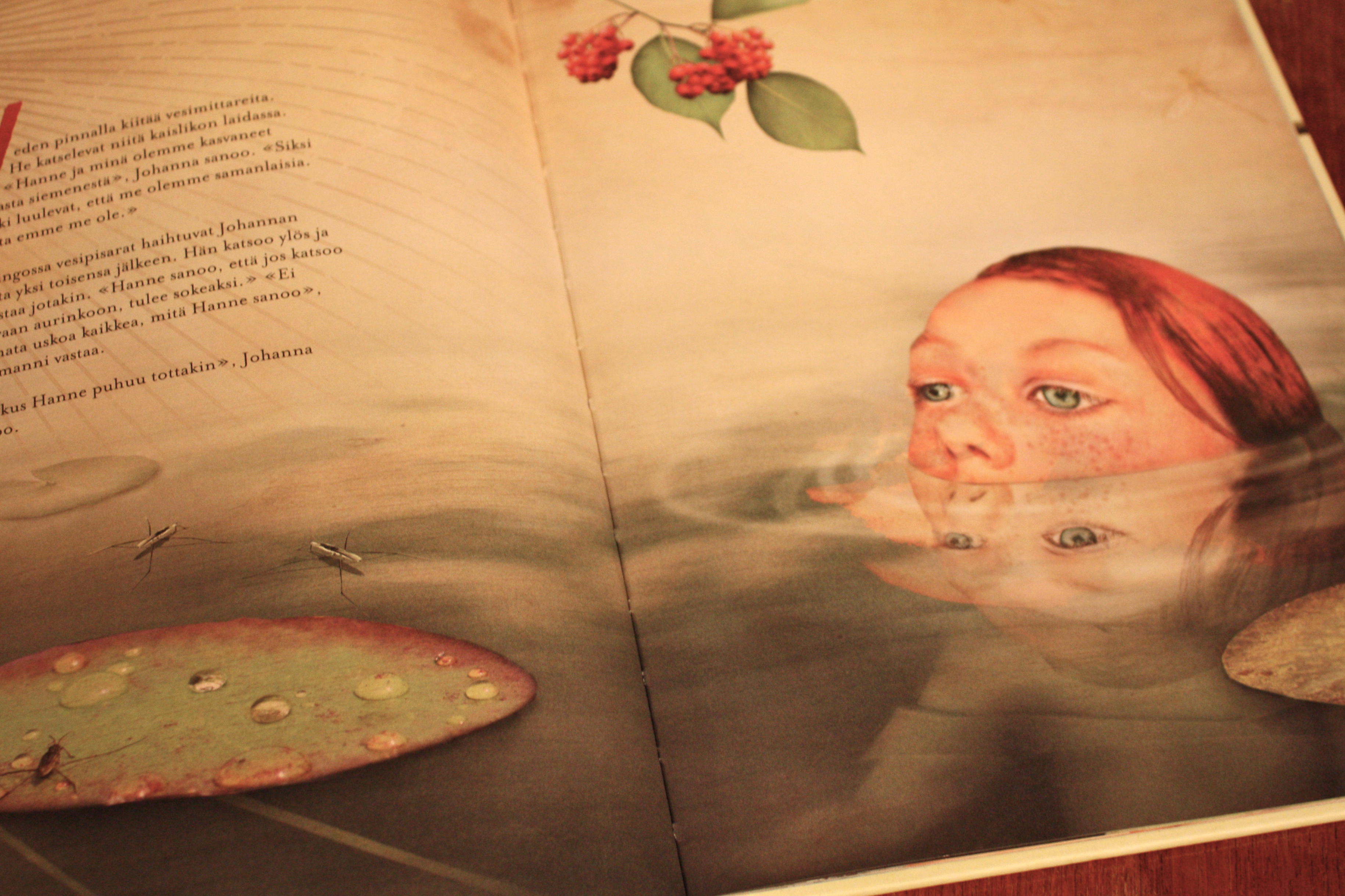 Hole käyttää kuvituksessaan valokuvakollaaseja ja photoshoppia ja jälki on tosiaankin aivan uskomattoman kaunis! Kirjaa selatessani tajusin, että ilkeästä Hannesta ja ankeasta koulunpihasta on tehty tarkoituksella häiritsevät rumia, jolloin ne luovat hienon kontrastin häikäisevän kauniille metsäkohtauksille, joissa luonto, salaisuudet ja lapsuus yhdistyvät unenomaiseen harmoniaan. Ihana kirja!