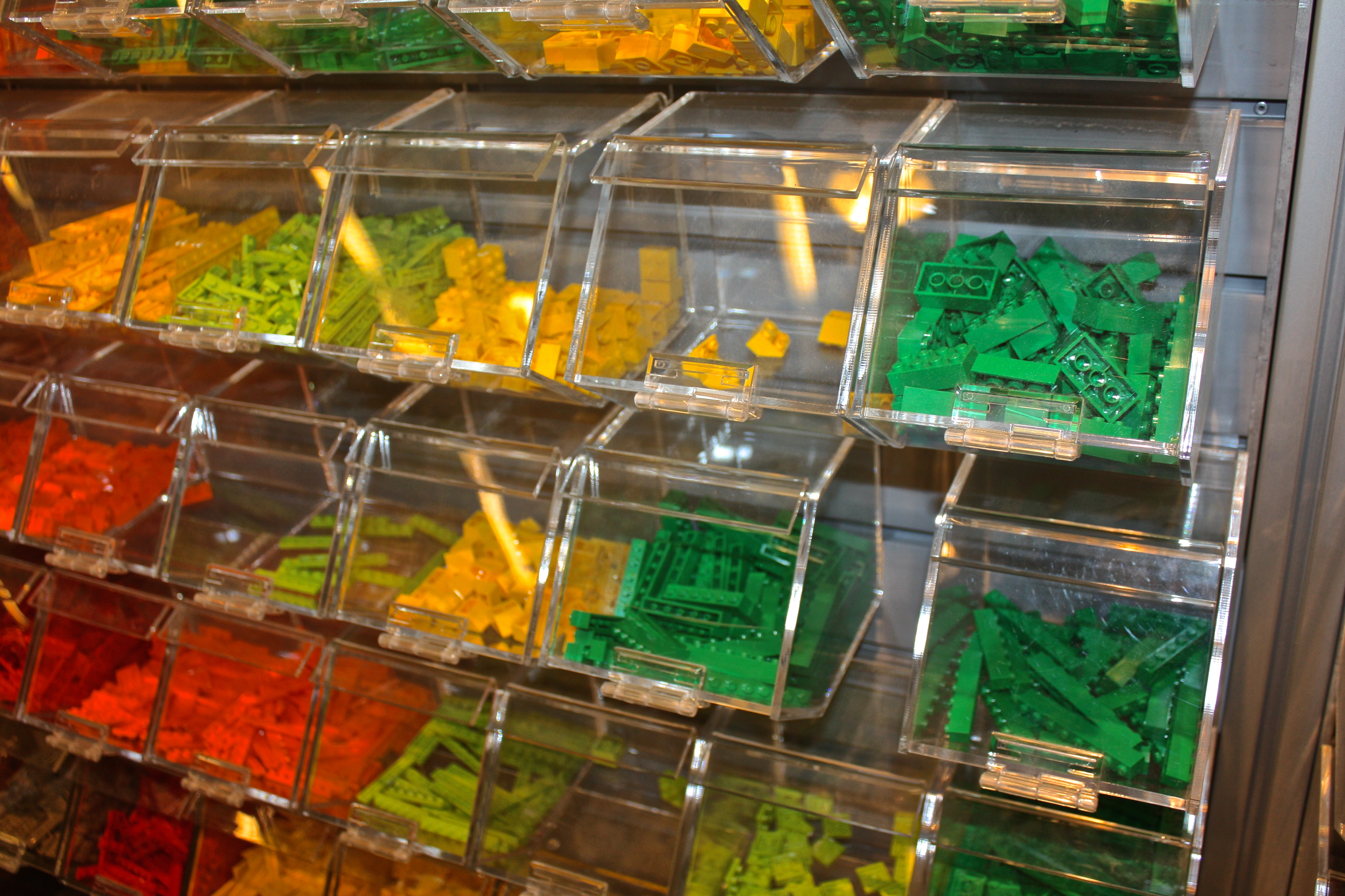 Kaupasta löytyy hyllymetreittäin pirteän värisiä Legoja, joita voi ostaa kuin irtokarkkeja. Kuva: Reeta / Les! Lue!