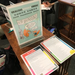 Ehdin kuunnella myös muutaman kirjailijahaastattelun. “Rakkaudesta kirjaan”-palkittu Seppo Puttonen veti tuttuun tapaan esikoiskirjapaneelia. Paikalla oli kuusi esikoiskirjailijaa, joiden kaikkien kirjat kuulostivat mielenkiintoisilta, mutta eniten itseäni kiinnostaa Christina Sandun ‘Valas nimeltä Goliat‘. Saa nähdä tarttuisiko kirja tänään messuilta mukaan.