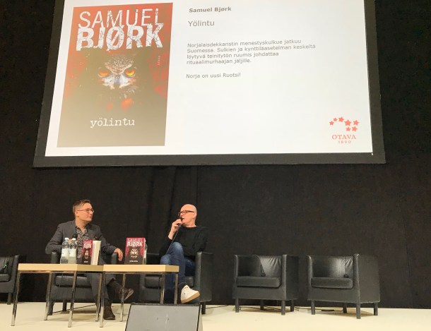 Sunnuntaina kävin kuuntelemassa mm. Samuel Bjørkiä, joka kertoi kirjoistaan ‘Minä matkustan yksin‘ ja ‘Yölintu‘. Bjørk pohdiskeli sitä miksi Nordic Noir on juuri nyt niin suosittua ja miksi Norjan kaltaisesta turvallisesta ja rauhallisesta maasta tulee niin paljon dekkareita. Bjørk epäili puolivakavissaan syyksi sitä, että me kiltit ja tunnolliset pohjoismaalaiset puramme patoutumamme fiktioon. Norjalaiset ja suomalaiset kipittävät kiltisti töihin myös pimeinä, kylminä ja loskaisina talviaamuina, mutta silti täydellisen ja tunnollisen julkisivun takaa saattaa löytyä vaikkapa syvää yksinäisyyttä. Koska olemme niin kohteliaita, emme kuitenkaan pura patoutumiamme oikeaan väkivaltaan, vaan kirjoitamme ne kiltisti dekkareihin.