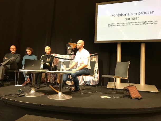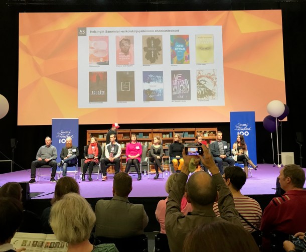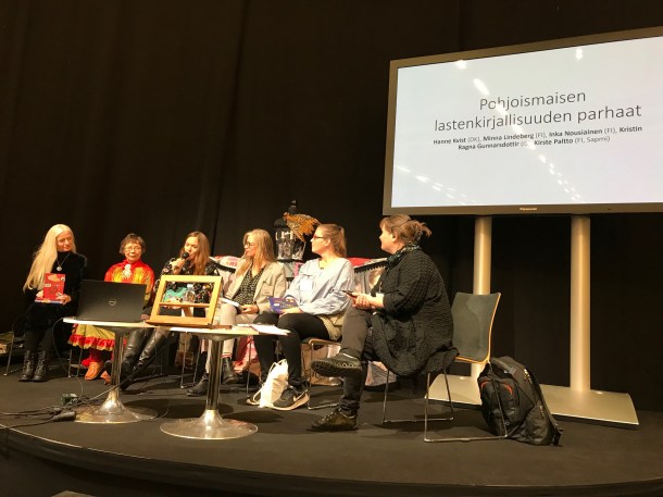Kirjamessuilla palkinnoista puhuttiin onneksi ainakin vähän. Sunnuntaina haastateltiin ehdolle asetettuja lasten- ja nuortenkirjailijoita ja prosaisteja (ja runoilijoita, joita en valitettavasti ehtinyt katsomaan). Suomesta paikalla olivat Minna Lindeberg, Inka Nousiainen, Laura Lindstedt ja Kirste Paltto, joka edustaa saamelaista kielialuetta. Norjasta paikalla olivat Vigdis Hjort ja Henrik Nor-Hansen. Kaikki nyökyttelivät, että lukisivat mieluusti toistensa kirjoja ja toivoivat, että niitä käännettäisiin puolin ja toisin. Tätä toivomme toki me lukijatkin. Tuota palkintogaalaa voi muuten seurata keskiviikkona suorana lähetyksenä Areenasta.